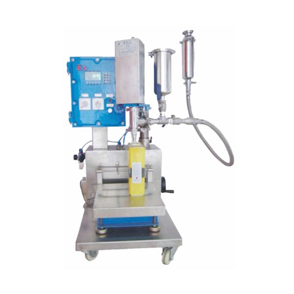 液體灌裝機(jī)主要由儲(chǔ)料斗、灌裝噴槍裝置、防爆控制柜、控制系統(tǒng)、稱重儀表、秤臺(tái)、升降裝置、氣動(dòng)球閥、無動(dòng)力輸送輥道,不銹鋼機(jī)架、壓蓋裝置等組成。