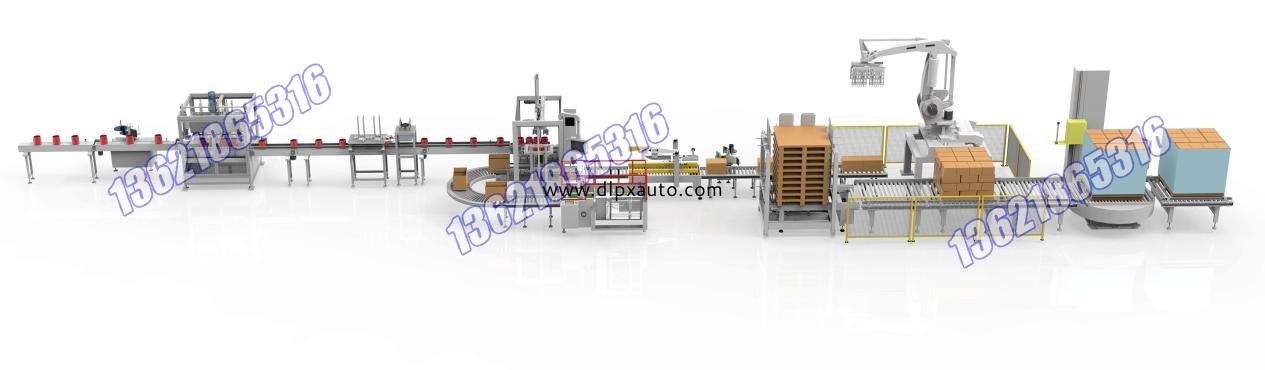 1-10L方桶、圓桶全自動整線組成部分:人工放桶(自動理桶機(jī))、自動打印貼標(biāo)機(jī)、全自動稱重灌裝機(jī)、自動上蓋壓蓋 機(jī)、自動開箱機(jī)、自動裝箱機(jī)、自動封箱機(jī)、箱自動貼標(biāo)機(jī)、自動供棧機(jī)、機(jī) 器人碼垛機(jī)組、在線圓盤式纏繞、整線控制系統(tǒng)參數(shù)信息:灌裝精度: ±0.1%灌裝容量: 1-10L方桶、圓桶生產(chǎn)速度: 600-1200桶/小時適用范圍: 各種乳膠漆、水漆、油漆等