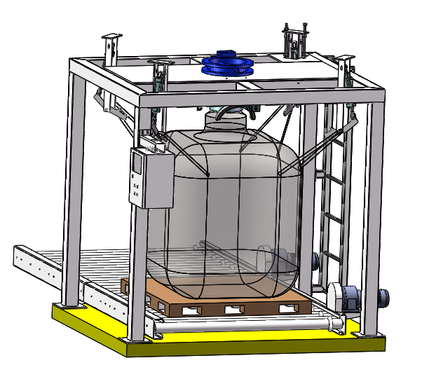 采用自流式重力給料結(jié)構(gòu),毛重式計量,三級給料控制結(jié)構(gòu),結(jié)合高精度稱重傳感器,給料速度可調(diào),減少料流沖擊,保證計量精度和速度。灌裝時只需人工掛袋,給定信號后,便可完成自動夾袋、灌裝、計量、滿稱時自動停機、松袋的工作循環(huán), 由叉車或輸送機直接輸出后吊裝儲運。