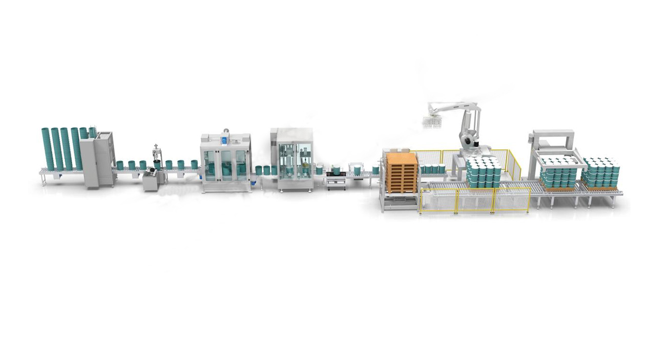 10-20L全自動包裝流水線(單線直連) 組成部分:人工上桶垛(桶垛提升機)、自動立式分桶機、自動轉(zhuǎn)桶打印貼標(biāo)機、全自動稱 重式液體灌裝機、全自動送蓋落蓋壓蓋機、在線檢重及剔除、轉(zhuǎn)桶定位、自動供棧 機、機器人碼垛機組、自動水