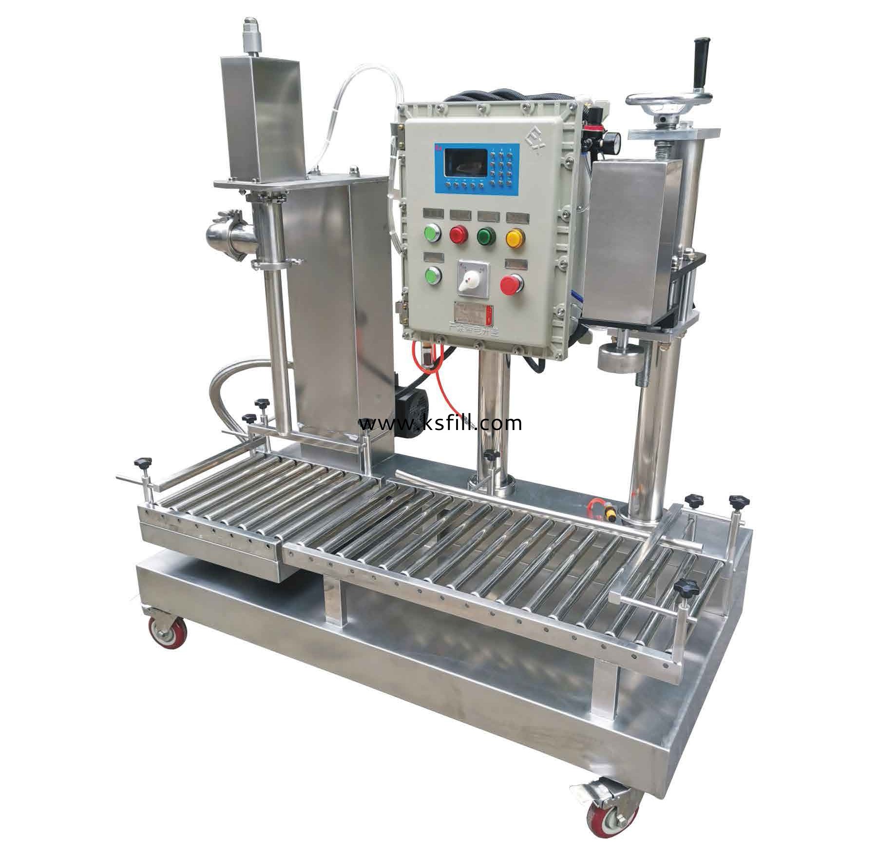 適用于:化工、食品、醫(yī)藥原料的定量灌裝量系統(tǒng)采用PLC可編程控制器制造,安全可靠??诠嘌b頭、管路采用快速接頭,拆洗方便。日采用兩段式自動(dòng)灌裝方式,準(zhǔn)確度高?!霎?dāng)灌裝頭未插入桶內(nèi)時(shí),自動(dòng)提嘴?;氐竭_(dá)灌裝目標(biāo)值,灌裝頭自動(dòng)升起。凈重/毛重二種灌裝方式自由選擇??诳稍O(shè)定和存貯30組配方供調(diào)用。