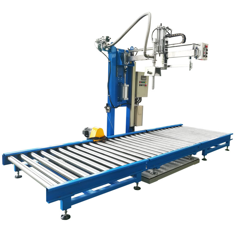 人工上桶,人工對口,自動(dòng)灌裝,人工放蓋,人工壓蓋,人工碼垛
