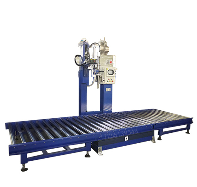 工作流程為:人工開蓋將空桶放在輸送線上,輸送線啟動(dòng),自動(dòng)輸送至灌裝工位,自動(dòng)對(duì)口自動(dòng)灌裝,首先進(jìn)入快速落料,到達(dá)一定重量(設(shè)定的小料重量)時(shí)轉(zhuǎn)換為慢速落料,當(dāng)重量到達(dá)目標(biāo)值時(shí)停止落料,計(jì)量完成即灌裝完成。當(dāng)灌裝完成后,自動(dòng)輸送至成品區(qū)人工鎖蓋,叉車移走成品桶,灌裝流程結(jié)束!