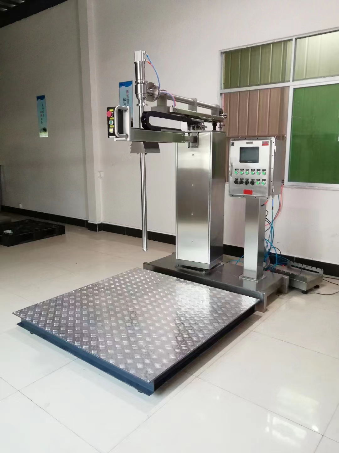 GZM-1000KMS液體灌裝機,是專門開發(fā)的適用于石油化工、醫(yī)藥、食品、軍工等企業(yè)工作環(huán)境的防爆液體灌裝機,采用液面上灌裝方式,適用于多種液體物料。設(shè)計獨特的噴槍裝置易于操作,灌注快速、精確;并且灌裝機大限度地保證灌注完畢時殘液的滴漏。操作時,操作者僅需簡單地將桶口對準(zhǔn)噴槍嘴正下方,按下手柄上的[啟動]按鈕, 噴槍就回自動插入桶內(nèi),并將空桶自動去皮。然后打開灌裝閥門,精確地雙速灌裝;灌裝結(jié)束,噴槍自動提升至桶外,滴漏盤自動接至噴槍底部,人工將桶推出磅臺推至輸送機后端即告完成。廣泛應(yīng)用于食品加工、制藥行業(yè)的生產(chǎn)車間及倉庫管理;化工行業(yè)中油漆、精細(xì)化工原料的生產(chǎn)工序控制和成品、半成品計量;軍工制造業(yè)中物料的計量。