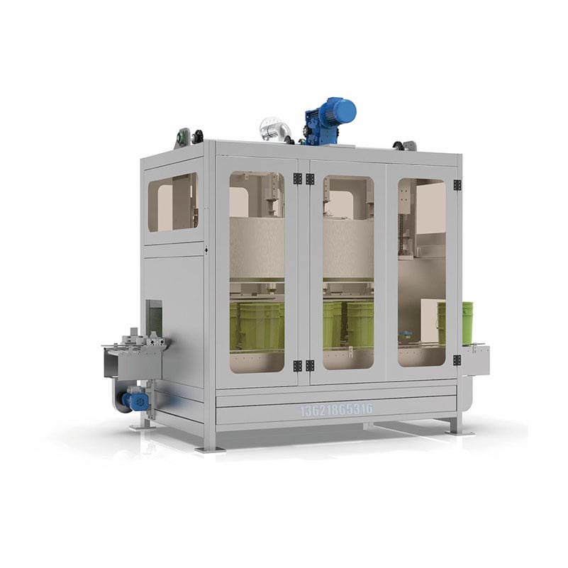 工作流程:空桶自動(dòng)輸送 - 空桶撥至稱重區(qū)同時(shí)自動(dòng)對桶口 - 空桶自動(dòng)除皮 - 自動(dòng)定量灌裝 - 自動(dòng)推重桶至鏈板輸送線 - 自動(dòng)上蓋同時(shí)自動(dòng)鎖蓋  - 重桶輸送到重桶待提區(qū) - 人工提走即完成