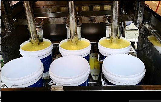 自動(dòng)進(jìn)桶,多頭灌裝,潛入桶底灌裝,稱(chēng)重定量灌裝,自動(dòng)供蓋,自動(dòng)分蓋上蓋,自動(dòng)封蓋。