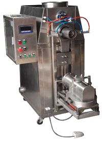 將閥口包裝袋套在加料嘴上,按動(dòng)“允加”按鈕,這時(shí)壓袋氣缸開(kāi)始工作并壓住袋口,控制器將包裝袋重量自動(dòng)去除,破拱電機(jī)緩慢轉(zhuǎn)動(dòng),保證下料暢通。加料螺旋高速轉(zhuǎn)動(dòng)迅速將物料灌入袋中,隨袋中空氣一起溢出的粉塵通過(guò)吸塵器由除塵器吸走,振動(dòng)裝置同時(shí)啟動(dòng)將托盤上袋中物料振實(shí)充滿袋角。待加料快到設(shè)定值時(shí),加料螺旋進(jìn)行減速慢加,到設(shè)定值時(shí),加料停止。誤差<0.3%。這時(shí)壓袋氣缸松開(kāi)袋口,將包裝袋放在皮帶輸送機(jī)上及時(shí)送出。